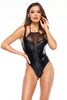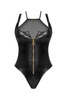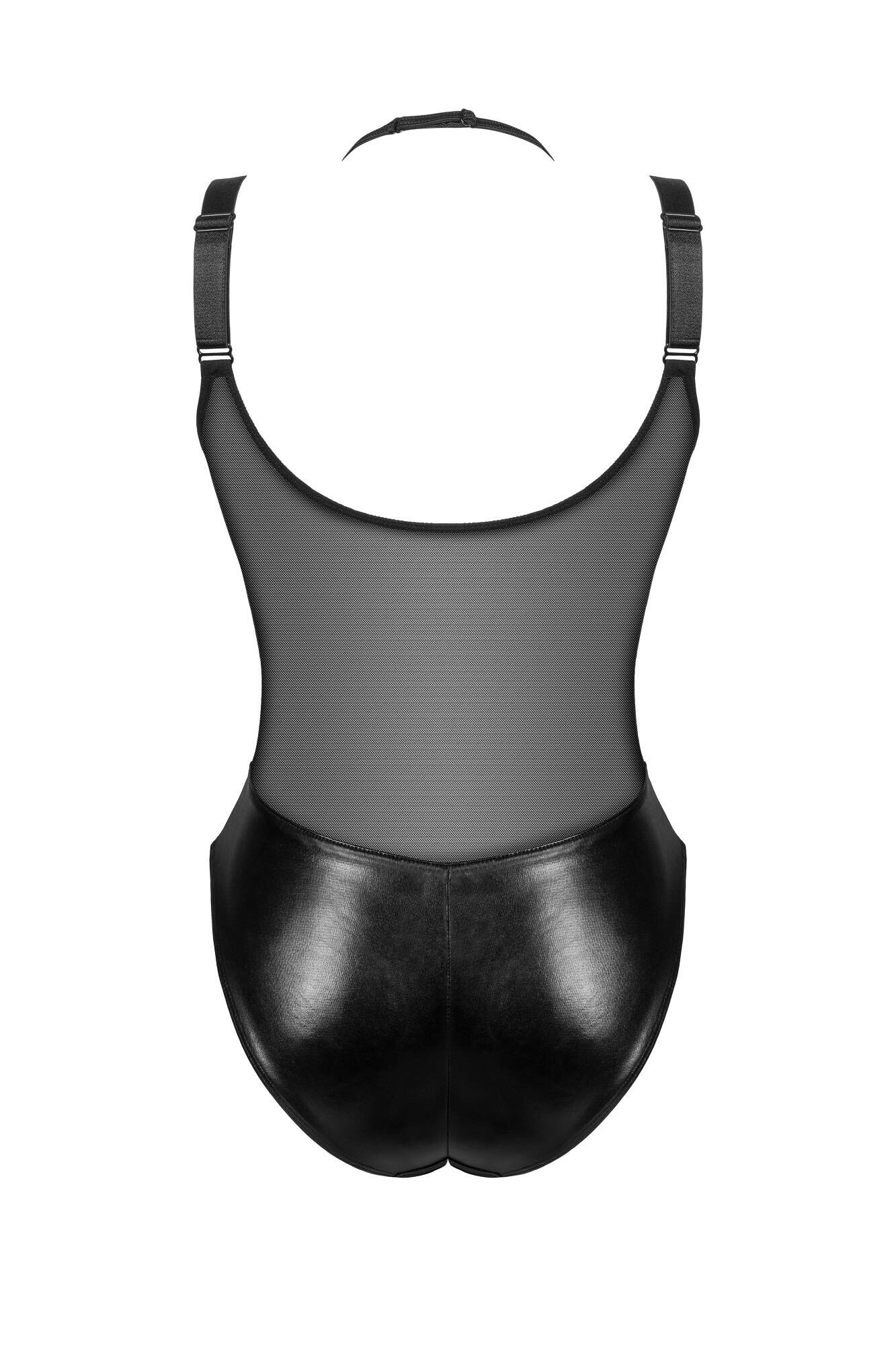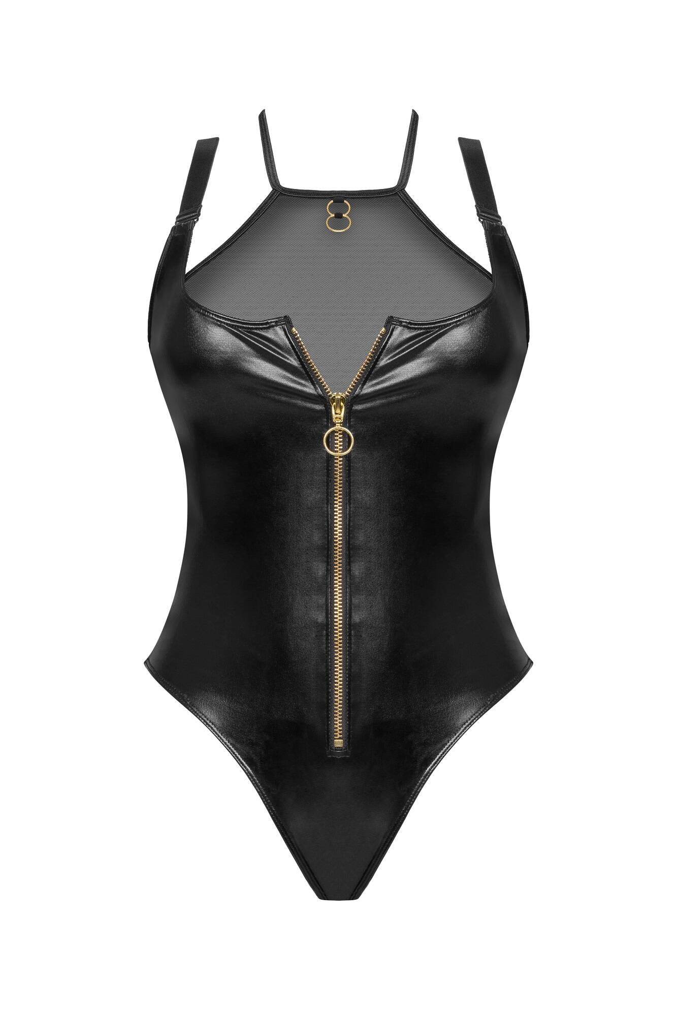 The "Roxana" bodysuit combines tulle and latex-like material to provide a sensual look and perfect fit. Thanks to the hook-and-eye closure at the crotch, the bodysuit can also be worn as a top for party outfits. Gold accents in the form of a zipper and neck rings add elegance and luxury. An ideal choice for evening outings and romantic encounters.