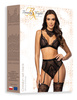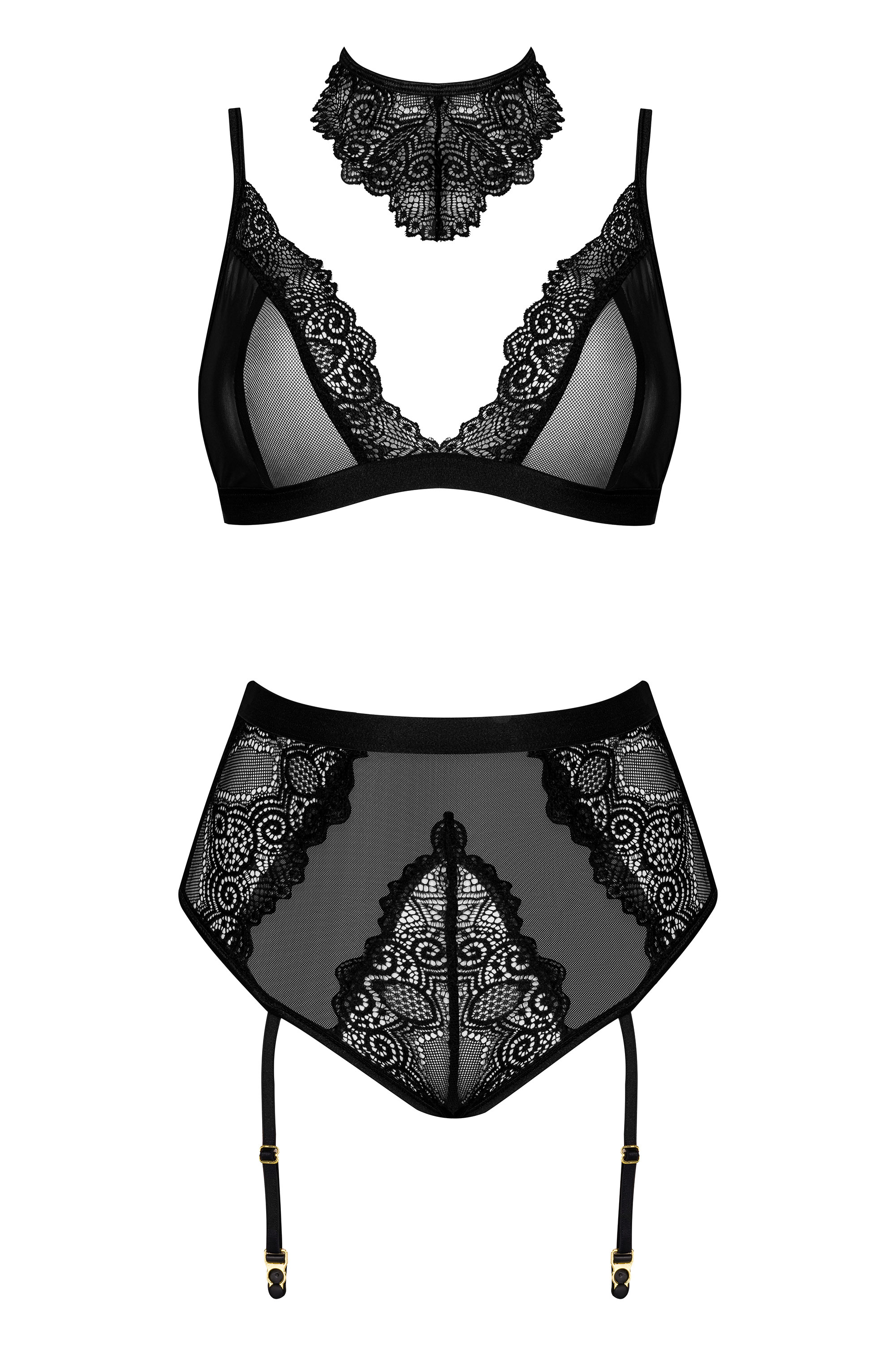 Cristalyn set black is a lingerie set that brings together refined elegance and daring charm. The lace embellishments and sheer mesh panels create a captivating look that enhances the female silhouette. The soft-cup bra gently embraces the bust, while the high-waist garter belt adds a touch of sophistication. The back, with its playful cut-out and semi-transparent finish, introduces an element of tempting mystery.