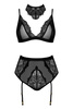 Cristalyn set black to komplet, który łączy w sobie subtelną elegancję i odważny styl. Koronkowe zdobienia i tiulowe prześwity tworzą hipnotyzujący efekt, który podkreśla kobiecą sylwetkę. Biustonosz z miękkimi miseczkami delikatnie otula biust, a wysoki pas do pończoch dodaje całości wyrafinowania. Tył z uroczym wycięciem i półtransparentnym materiałem wprowadza nutę zalotnej tajemniczości.