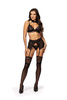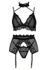 Velvet Sin set to propozycja dla kobiet, które pragną połączenia subtelności i zmysłowej odwagi. Koronkowy biustonosz z paseczkami oraz chokerem tworzy efektowną oprawę dla dekoltu, a pas do pończoch podkreśla linię talii i bioder. Stringi z koronką i paskami dodają całości charakteru, tworząc look, który zachwyca zarówno elegancją, jak i odważnym wyrazem.